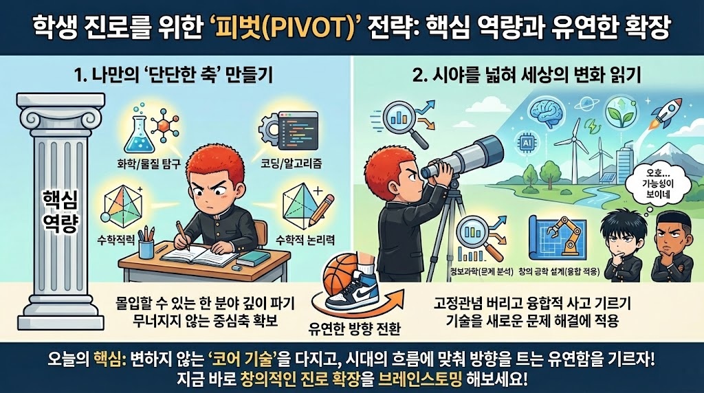 학교 교육과정에서도 이러한 융합적 시야를 기를 수 있습니다. 정보 교과의 '정보과학'을 통해 문제 분석과 알고리즘 설계를 배우고, 기술·가정 교과의 '창의 공학 설계'를 수강하며 기존 기술을 새로운 문제 해결에 적용해 보는 경험을 쌓는 것을 적극 권장합니다. 이 과정 자체가 곧 피벗의 훈련입니다.