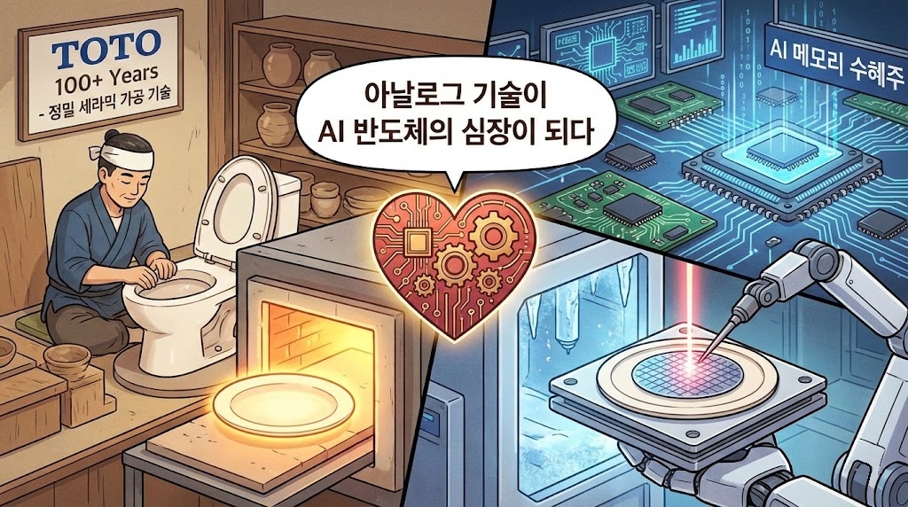 일본의 최대 위생도기 제조사인 TOTO(토토)는 최근 경제 시장에서 단순한 변기 회사가 아닌 'AI 메모리 수혜주'로 재평가받으며 뜨거운 감자가 되었습니다. 이 놀라운 반전의 비밀은 바로 변기를 굽는 '정밀 세라믹 가공 기술'에 숨어 있었습니다.