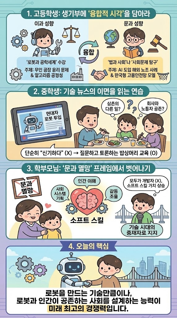 고등학생이라면: 생기부에 '융합적 시각'을 담아라 이과 성향의 학생이라면 '로봇과 공학세계'를 수강하면서 수행평가 주제로 '무인 공장 도입 시 발생하는 윤리적 문제와 알고리즘의 공정성'을 다루어 보십시오. 문과 성향의 학생이라면 '법과 사회'나 '사회문제 탐구'에서 'AI 도입에 따른 해외 노조의 단체협약 사례와 한국형 고용안전망 모델'을 보고서로 작성해 보는 것을 강력히 추천합니다.