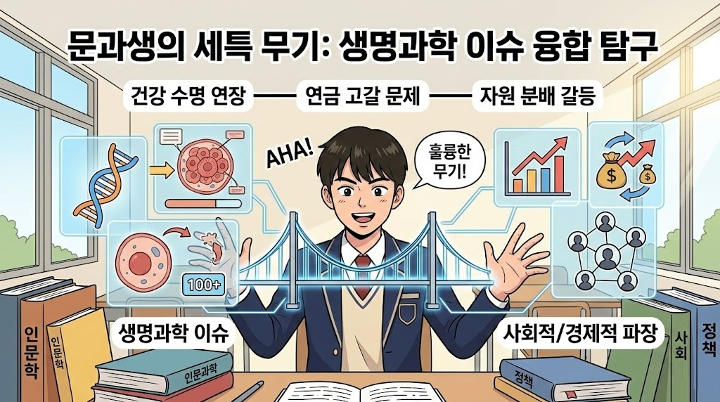 A. 적극 권장합니다. 오히려 훌륭한 무기가 됩니다. 과학 기술이 우리 삶에 미치는 경제적, 사회적 파장을 분석하는 능력이야말로 문과(사회과학/인문학) 인재에게 가장 요구되는 핵심 역량입니다. [사회문제 탐구] 과목에서 건강 수명 연장으로 인한 연금 고갈 문제나 자원 분배 갈등을 다룬다면 훌륭한 융합적 탐구가 됩니다.