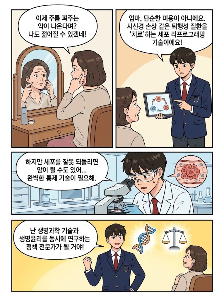 과학기술의 발전은 반드시 사회적, 윤리적 갈등을 동반합니다. 철학, 사회학, 행정학, 공공정책학을 지망하는 학생은 이 회춘 기술이 가져올 파급 효과를 비판적으로 바라보아야 합니다.