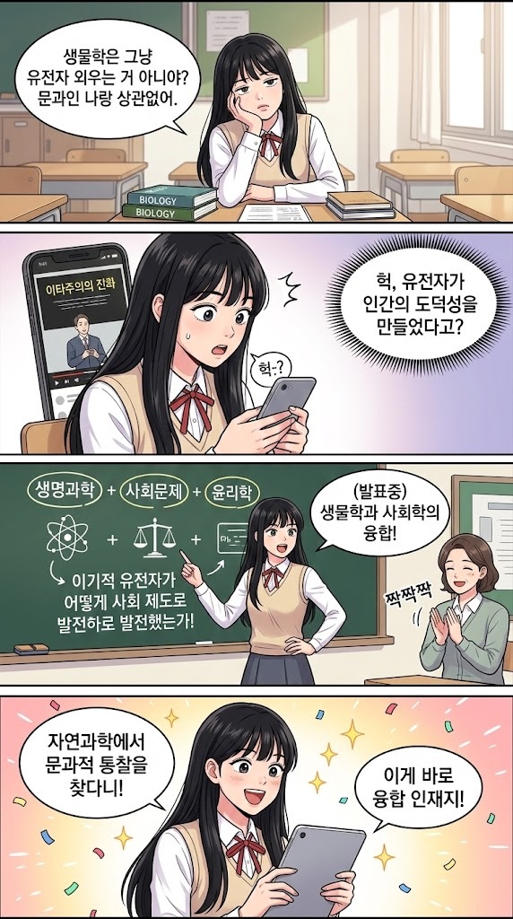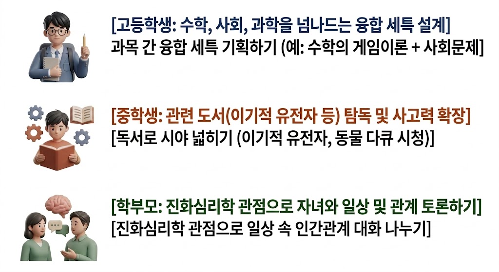 중학생이라면: 독서와 다큐멘터리로 시야 확장하기 아직 고교학점제 선택이 남은 중학생은 생각의 근육을 키워야 할 때입니다. 리처드 도킨스의 『이기적 유전자』를 읽어보되, 유전자가 이기적이라는 뜻이 아니라 '이기적인 유전자가 생존을 위해 개체의 이타적 행동을 조종한다'는 진짜 의미를 파악하도록 지도해봅시다. EBS의 동물 행동 관련 다큐멘터리를 보며 동물의 협력을 기록해보는 것도 좋습니다.
