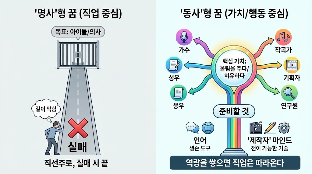 여기서 우리는 진로 설계의 패러다임을 완전히 바꿔야 합니다. 상담을 하다 보면 안타까운 경우가 많습니다. "저는 아이돌이 꿈이에요", "저는 의사가 꿈이에요". 이렇게 장래 희망을 '직업 명칭(명사)'으로만 정하는 경우입니다.