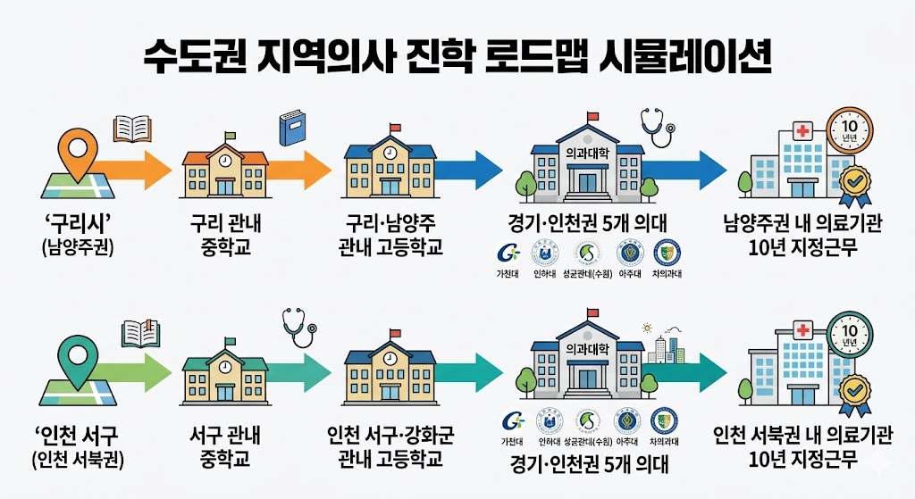 A학생이 지역의사 전형을 노린다면, 고등학교 역시 반드시 이 4개 시·군 안에 위치한 학교(예: 구리여고, 동화고 등)로 진학해야 합니다. 무사히 이 권역에서 고등학교를 졸업했다면, 경기·인천 지역에 배정된 가천대, 성균관대, 아주대, 인하대, 차의과대 등 5개 의과대학의 지역의사 전형에 지원할 자격을 얻습니다.