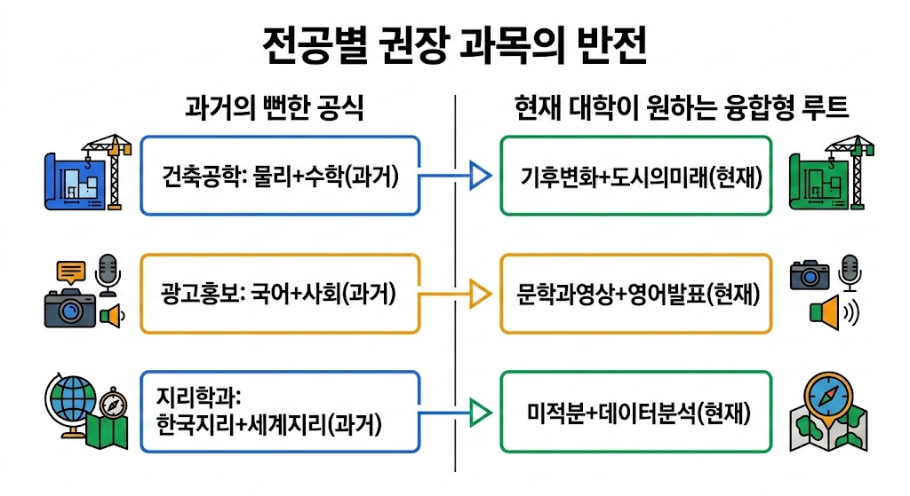 고등학교 입학을 앞두거나 고교학점제 수강 신청 기간이 다가오면, 많은 학생과 학부모님들이 비슷한 공식에 빠집니다. "건축공학과 갈 거니까 물리랑 미적분, 기하만 들으면 완벽하겠지?" 혹은 "미디어학과니까 국어랑 사회에 올인해야지."라고 생각하시는 경우가 많습니다. 과거의 입시 공식에서는 꽤 안전한 선택이었습니다.